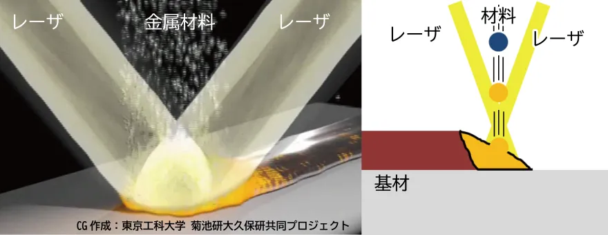 加工ヘッドの中心から金属材料を噴射し、周囲から複数のレーザ光で、加熱・溶融します。