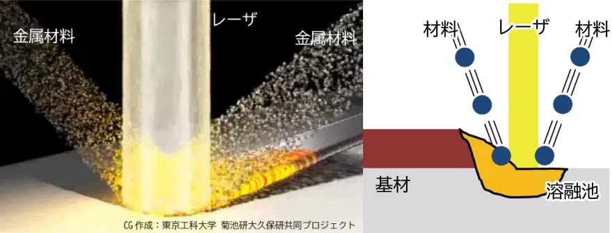 サイドから原料粉末が噴射供給される一般的な DED では、原料の飛散や熱ひずみが発生します。