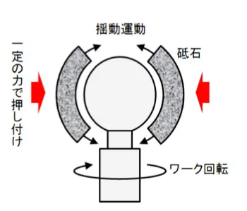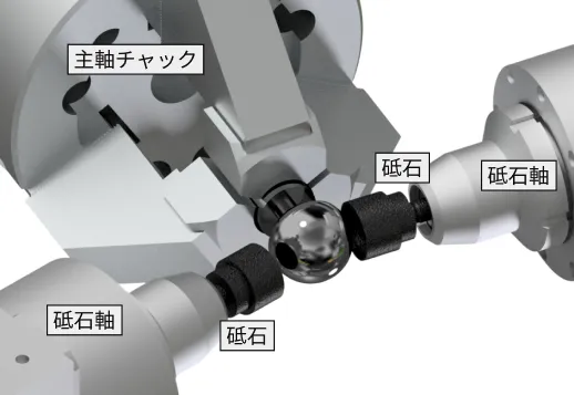 球面形状に合わせて動く専用砥石を用いることで、立体的な球体にも均一に当たり、面粗度や真球度を高精度に仕上げられます。